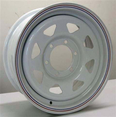 16 x 7 White 8 Spoke Steel Wheel 6 stud 139.7 PCD 30P offset and with red & blue stripes on outer rim edge