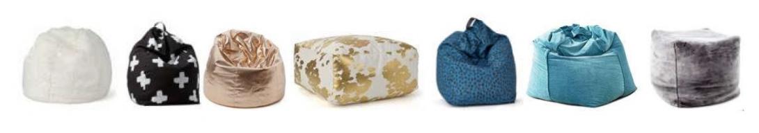Adairs Kids bean bag covers (Arctic Faux Fur, Printed, Metallic, RJL, Faux Cow Hide Pouf) and Adairs adult bean bag covers (Home Republic Carmen Velvet, Home Republic Montana Fur Pouf, Home Republic Metallic)