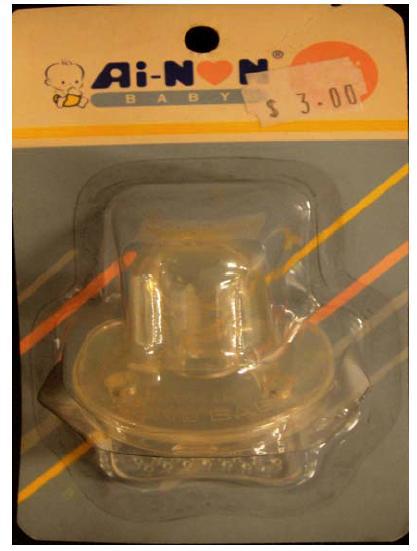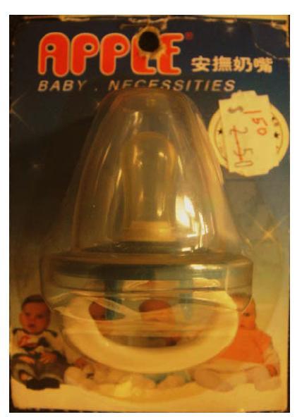 The shield and small ventilation holes may block the airways of a young child. In addition the ring on these dummies can detach and create a choking hazard.