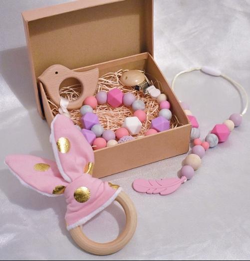 Matching gift set with dummy chain, feather teething necklace, silicone and fabric teething ring