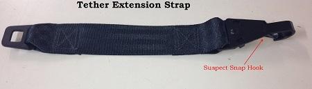 The metal snap hook on the Tether Extension strap may deform under load (as may be experienced in a collision). This is due to incorrect hardening of the metal parts.