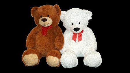 The toy is a plush bear in dark brown and white colour variants with a red ribbon on the neck.