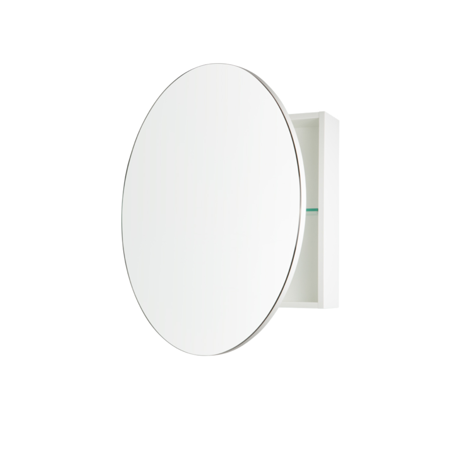 A wall-mounted bathroom mirror cabinet with a round mirror door and glass shelf