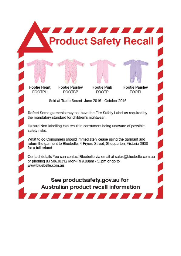 Some products may not contain fire warning labels, so the product is not compliant with the mandatory standard for children’s nightwear and limited daywear, AS/NZS 1249:2003, as amended by the regulation.