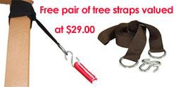 Two black straps made from webbing with rings on the end and an S hook. Products were offered for indiviual sale and also as a free gift with the purchase of a hammock.