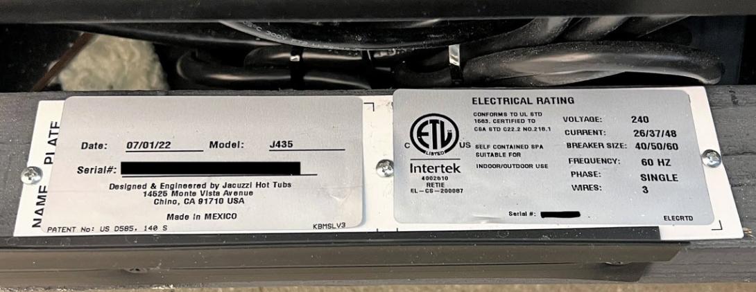 Model and serial numbers are engraved into a silver plate located in the equipment bay of the hot tub.