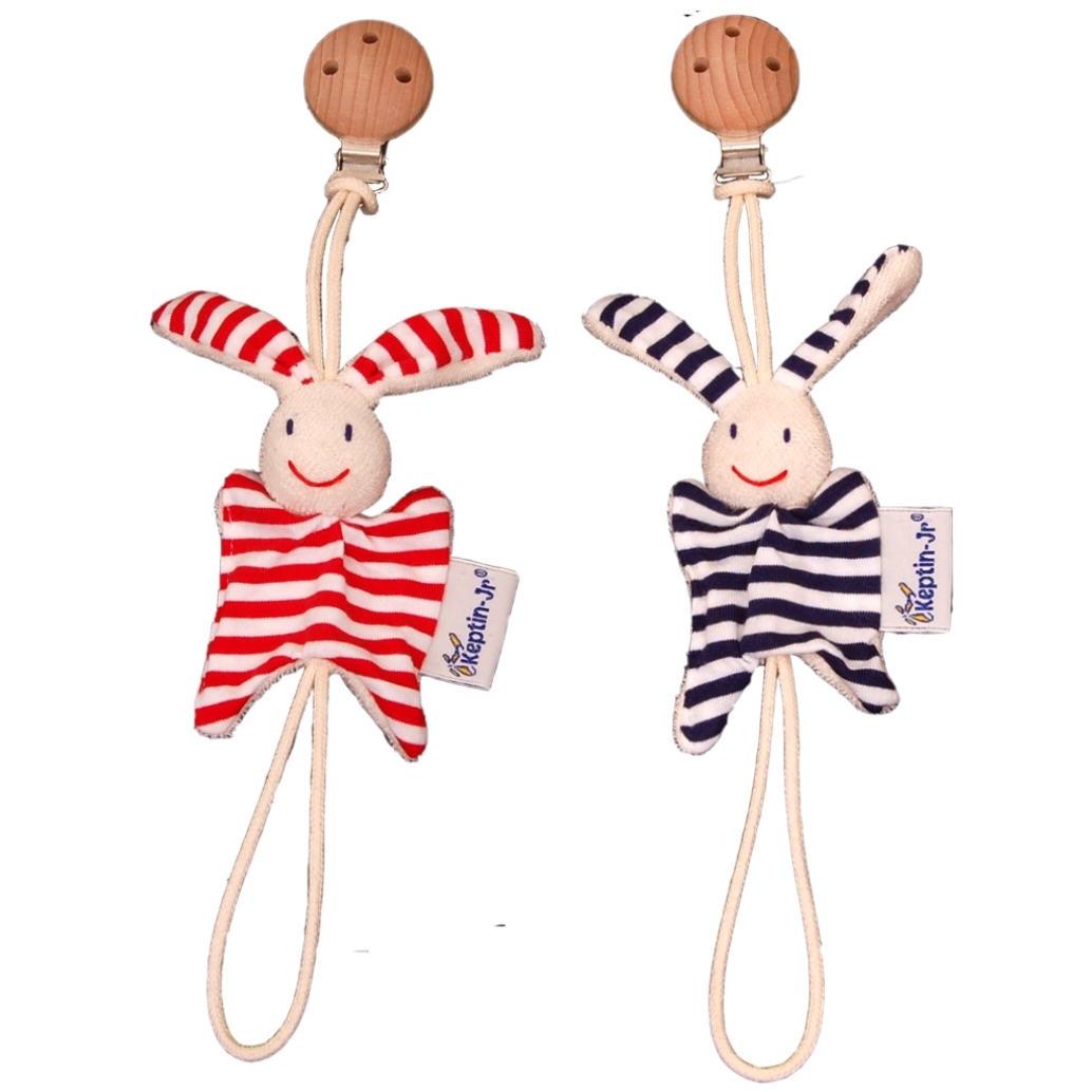 The pacifier holder has a textile ribbon to which is attached a rabbit head, ears and a body made of soft textile in two different colours (red & white striped and blue & white striped). The garment fastener is made of metal affixed to a wooden disc and the soother fastener has a fixed loop of textile cord.