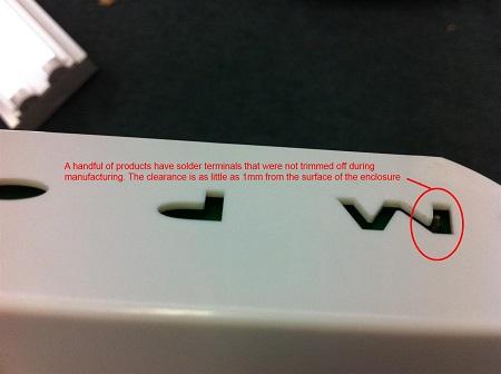 There exists a manufacturing fault where a small number of products have untrimmed input power terminals located at the underside of the control box. The untrimmed terminals could potentially extend to, or close to, the surface of the underside of the control box, where a small ventilation cavity exists.