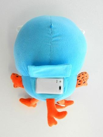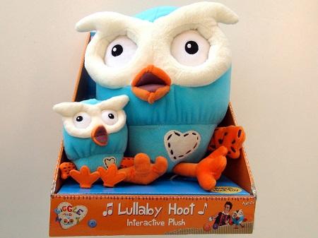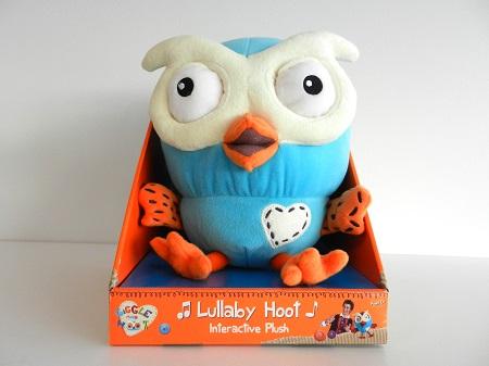 Lullaby Hoot Interactive Plush Toy, approximately 24 cm high, which plays Hoot’s lullaby song when the left wing is pressed. The plush toy has a battery compartment on the lower rear, which is covered by a Velcro flap.
