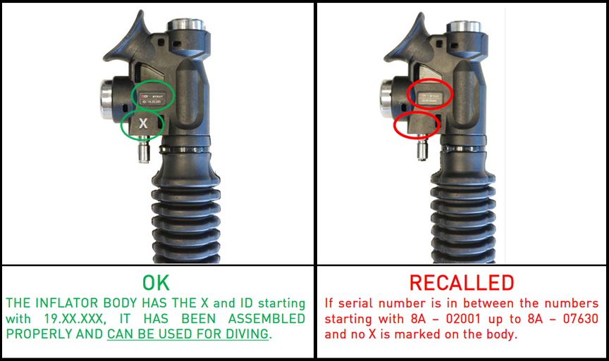 Repaired inflators are marked with an engraved 'X' near the serial number. No further action is required if your inflator has this mark.