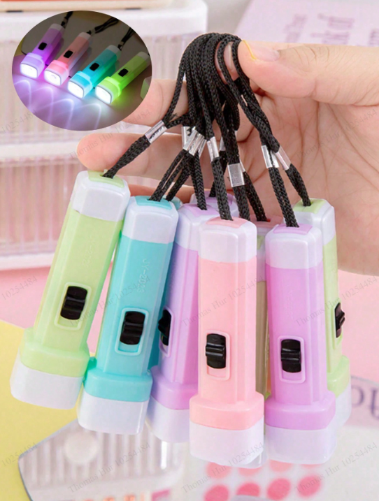 Small portable LED flashlight in assorted pastel colours with matching lanyard.