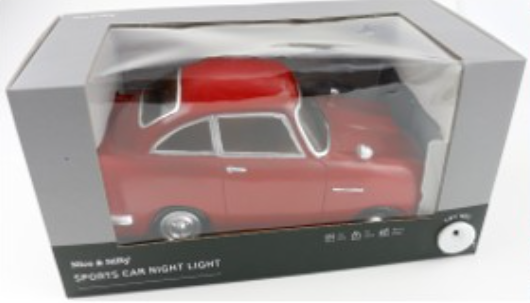 The Nice & Nifty Sports Car Night Light packaging does not contain safety warnings or markings regarding button batteries.