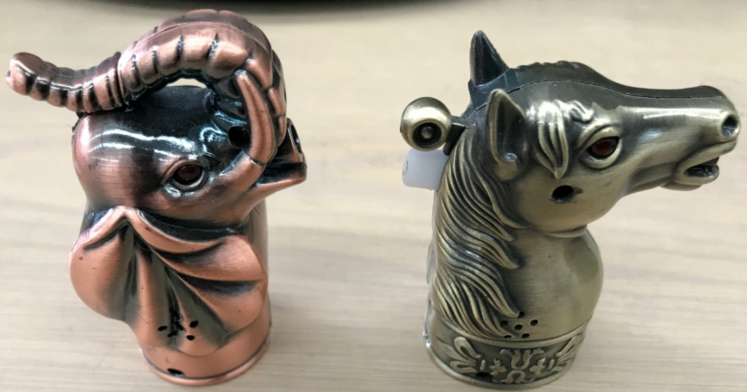 Novelty cigarette lighters in the shape of a horse head or elephant head.