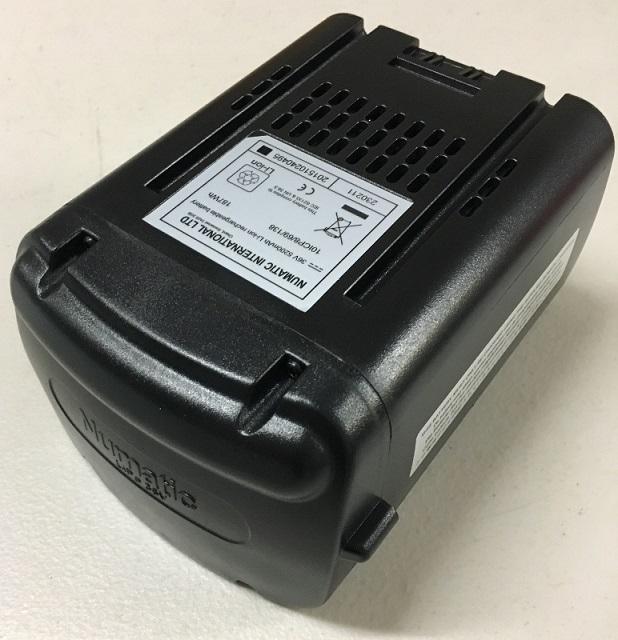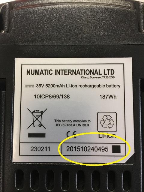 Numatic International Lithium Battery UN3480 36V 5200mAh Li-ion rechargeable battery codes 230211/604506 used in Numatic Vacuum Cleaners RSB140 Battery Ruc-sac and NBV190 Battery Henry Vacuum. Batteries are black and have the manufacturer's serial number on a silver sticker panel on the side of the battery.