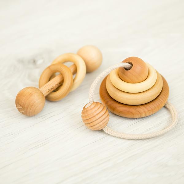 Organic Wooden Rattle - Round wooden beads at the end of a piece of dowel with 2 wooden rings to create the rattle aspect of the toy.