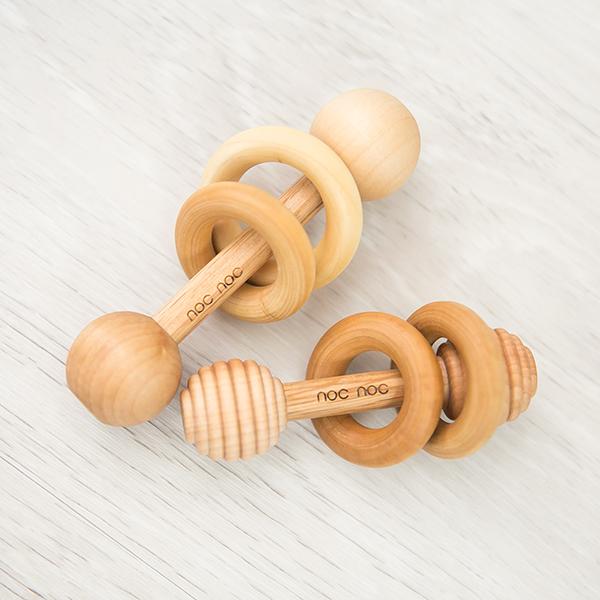 Miniature Organic Wooden Teething Rattle - Honeycomb beads on the end of dowel with 2 rings to create the rattle aspect of the toy.