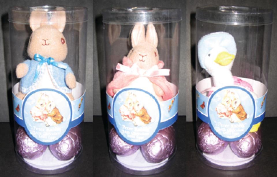 Barcode 9315371015586. Peter Rabbit small plush 11cm in acetate cylinder 100gm Barcode 9315371015579. Jemima small plush 11cm in acetate cylinder 100gm Barcode 9315371015562. Flopsy small plush 11cm in acetate cylinder 100gm Barcode 9315371014688. Peter Rabbit melamine mug and small plush & egg 60gm Barcode 9315371004894. Peter Rabbit, Flopsy and Jemima small plush 11cm in acetate cylinder 100gm Barcode 9315371015500 Peter Rabbit, Flopsy, Jemima Small Plush Acetate Cylinder 34g Barcode 9315371015548. Peter Rabbit CD, small plush and egg 34gm