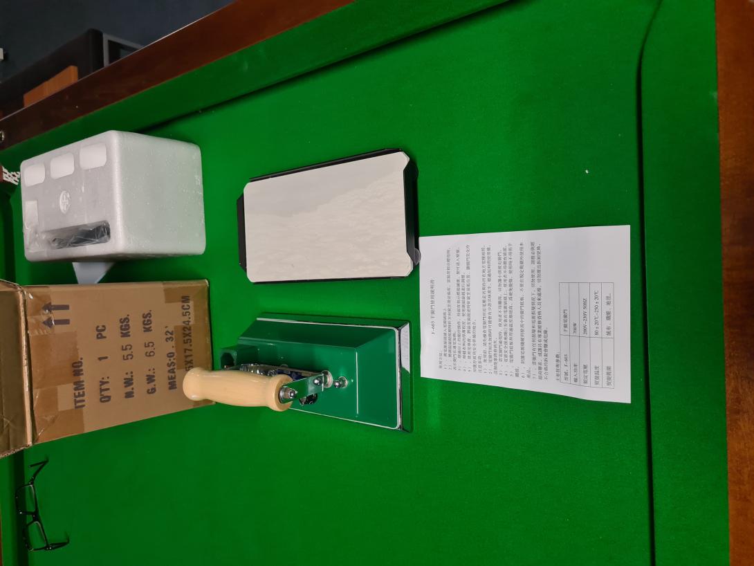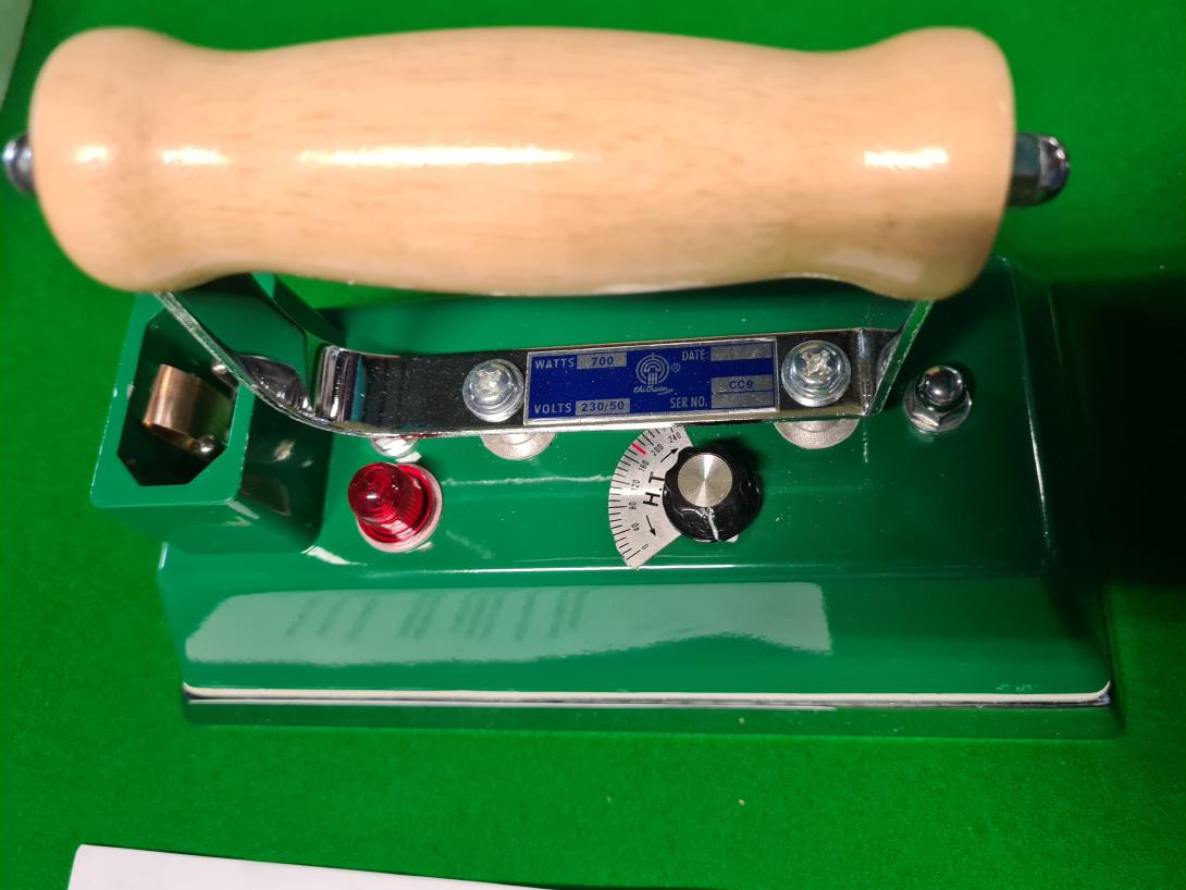 Iron has a green body with a heat-insulating layer between the ironing surface and the body of the iron. The iron rests on a flat heat-resistant stand.