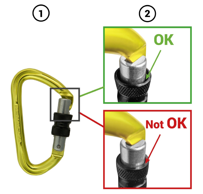 In some instances, the screwgate (the black part) in the carabiner may be assembled upside down.