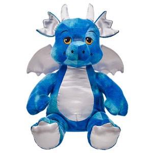 The Starbrights Dragon is a Build-A-Bear stuffed toy covered in soft blue fabric, silver light-up horns on its head and silver wings on its back. The stuffed dragon is approximately 18 inches high and 10 inches wide. Tracking label ending with 2248 can be found on a sewn in label on the backside of the left leg of the stuffed dragon.