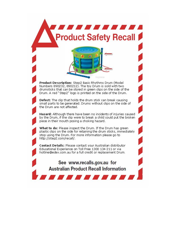 This recall involves the “Step2 Basic Rhythm Drum” (Drum), intended for preschool age children. The toy Drum is sold with two drumsticks that can be stored in clips on the side of the Drum. A red “Step2” logo is printed on the side of the Drum.