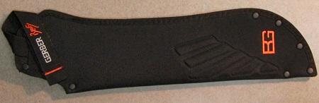 The stitched sheath is made of black nylon, with only stitching on the curved side. There are five rivets on the bottom of the sheath and two rivets bordering the strap on top. The machete measures 50 centimetres (19.5 inches) with a blade length of 34 centimetres (13.5 inches). The sheath measures 40 centimetres (16 inches) long and 9 centimetres (3.5 inches) wide, and has “GERBER” printed in gray and two Bear Grylls logos in orange. The stitched sheath has a total of seven rivets and is the only one of the two styles of sheaths sold with the Parang machete included in this recall. The other type of Parang sheath has two snap buttons and is not being recalled.