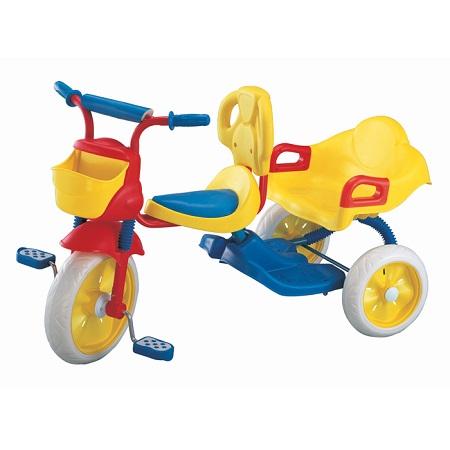Tandem Trike manufactured by Toy Group Australia Unlimited (TGA) is a trike that allows two passengers to ride in tandem. It has a 40 kg weight rating and is predominantly yellow, blue and red in colour.