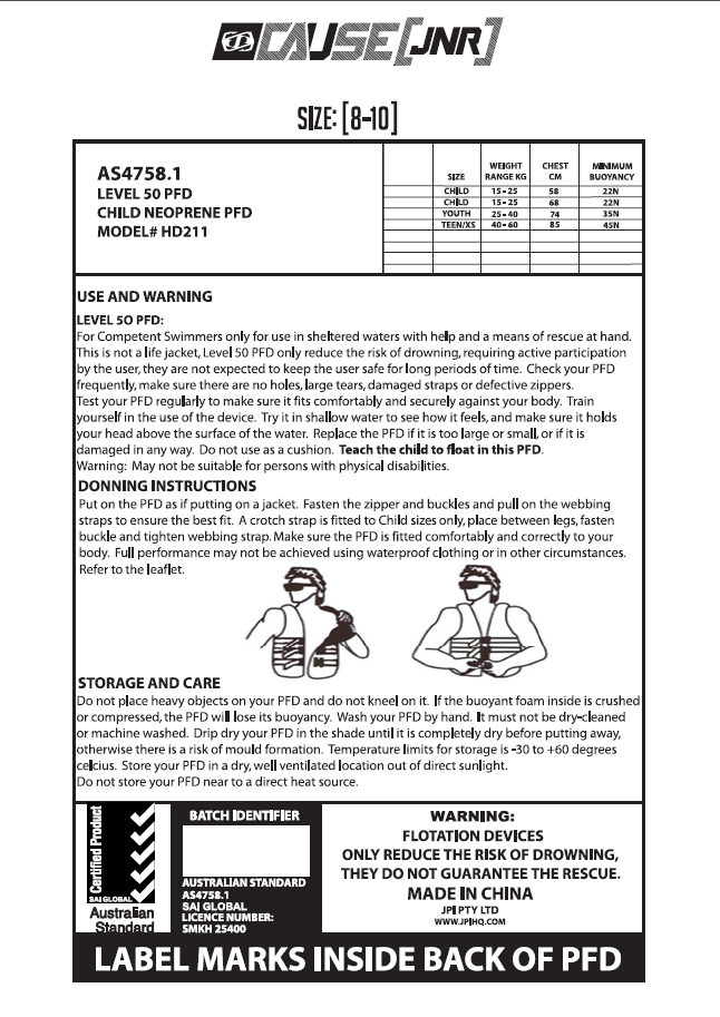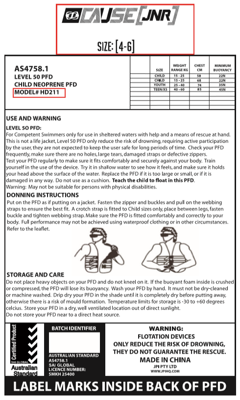The product does not comply with the minimum buoyancy requirements of the voluntary Australian Standard AS 4758.1:2015 for lifejackets. The flotation material in the product provides insufficient buoyancy.
