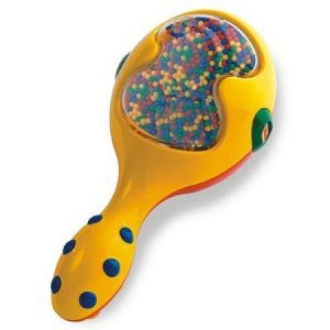 The rattle is made of red and yellow plastic, is filled with small multi-coloured beads and has "teething dots" on the handle. The packaging is marked "12 months and older".