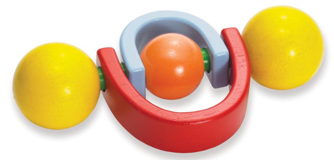 Wooden rattle, features a wooden ball within two u-shaped wooden arches that twirl around centre. Bright colours that are made from non-toxic water based finishes.
