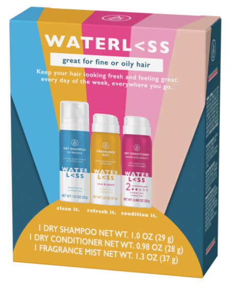 The Regimen Pack contains a dry shampoo 29g, a dry conditioner 28g and fragrance mist 37g.