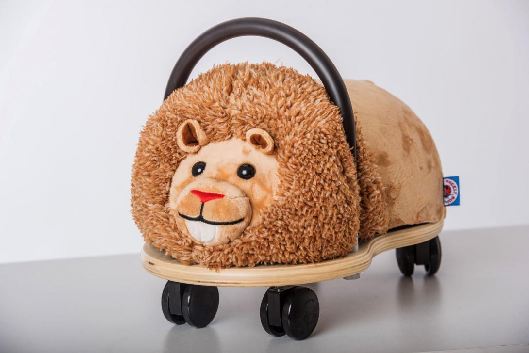A ride on toy in the shape of a lion with 4 casters and a curved handle. The cover is made from plush material.