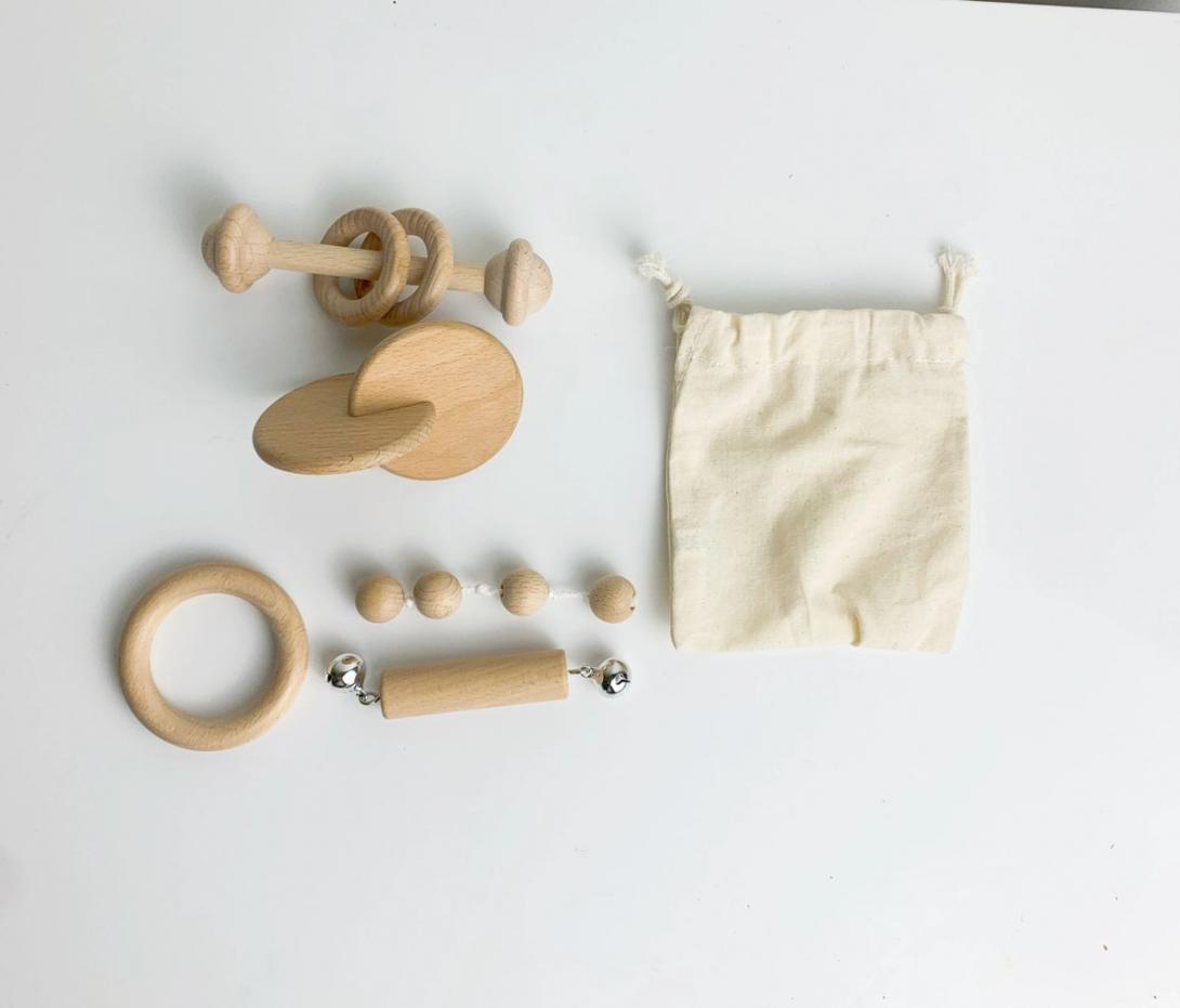 Barbell ring rattle and bell rattle sold as a part of the Wooden Montessori Rattle Interlock Beads Ring Set of 5 With Bag Natural Finish Bundle