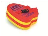 Four EVA (foam) layers held together by a red nylon adjustable strap that passes through each layer. The nylon strap is fitted with a double action buckle (two-piece - male and female - buckle) that serves to secure the strap round the user's body. The buckled strap holds the flotation device against the user's back to support the swimmer in the water.